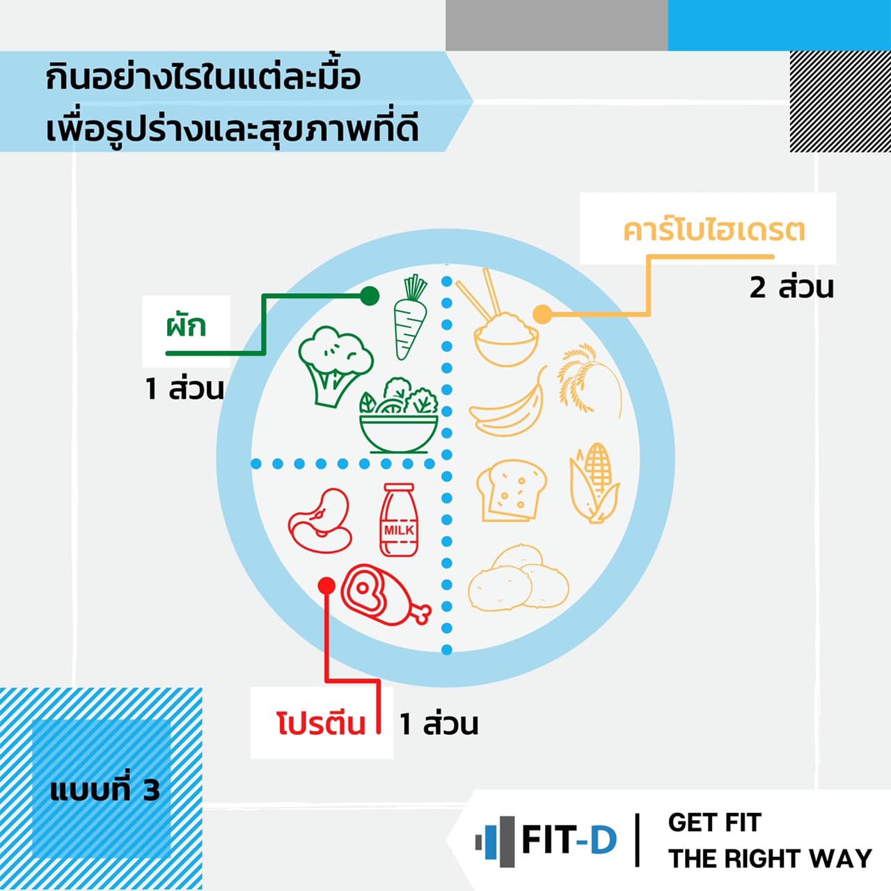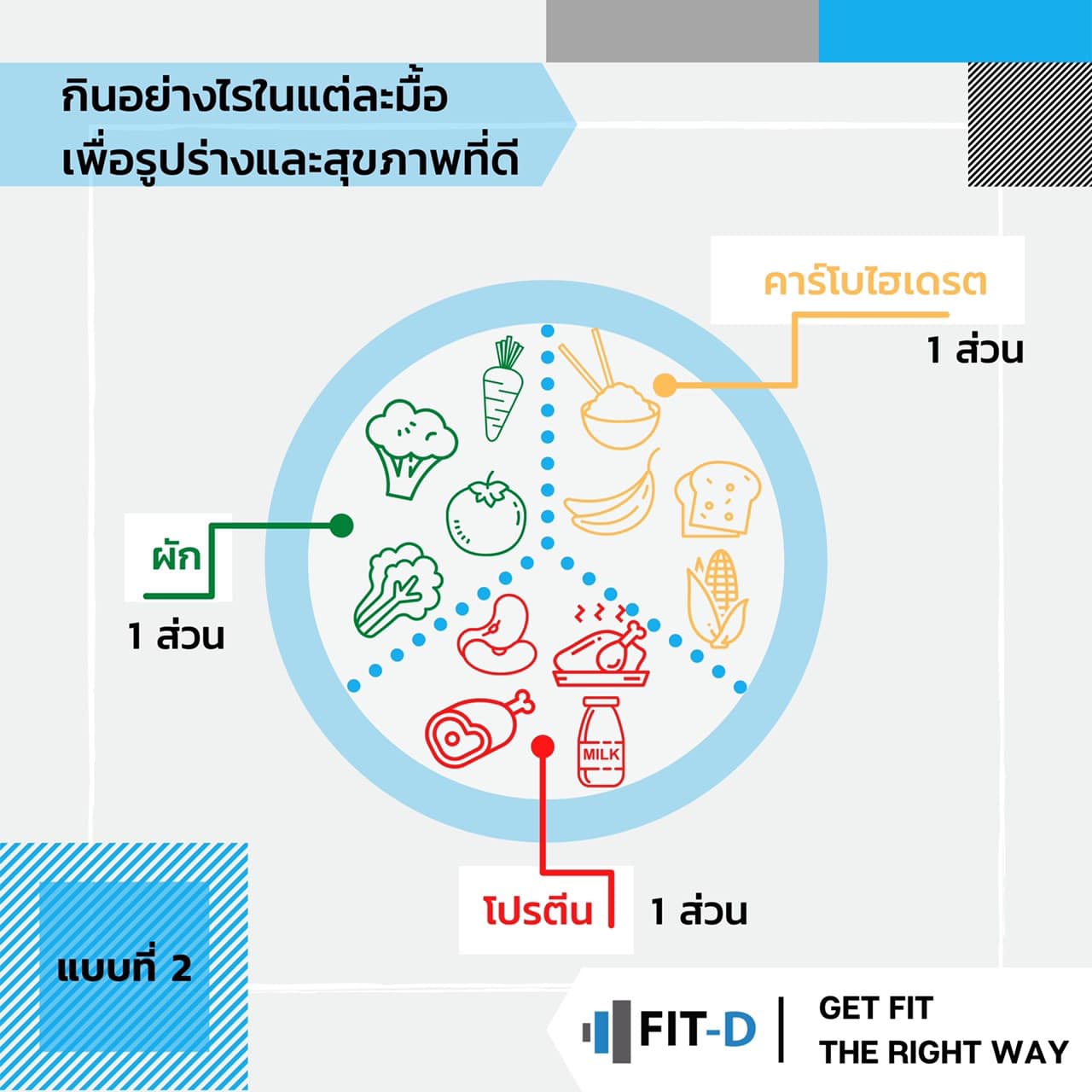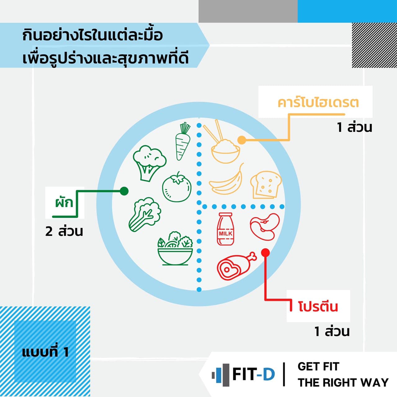 1.คนที่ออกกำลังกายน้อย เคลื่อนไหวร่างกายน้อย แต่อยากจะมีสุขภาพและรูปร่างที่ดีขึ้น (รูปที่ 1) : ผัก 2 ส่วน, โปรตีน 1 ส่วน และคาร์โบไฮเดรต 1 ส่วน